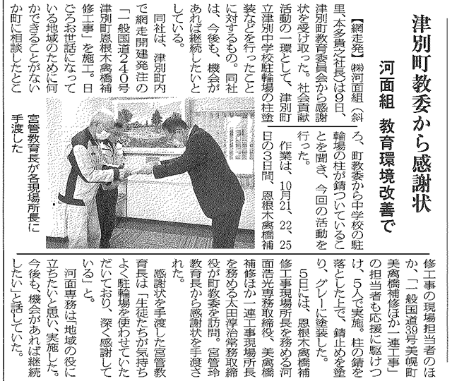 社会貢献活動の一環として、津別町立津別中学校駐輪場の柱塗装などを行ったことに対して、津別町教育委員会様より感謝状を頂きました。