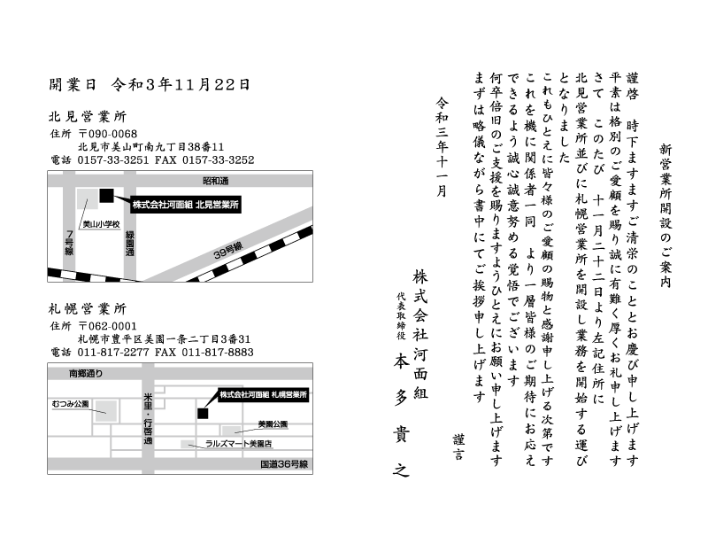 このたび、11月22日より下記住所に北見営業所並びに札幌営業所を開設し業務を開始する運びとなりました。